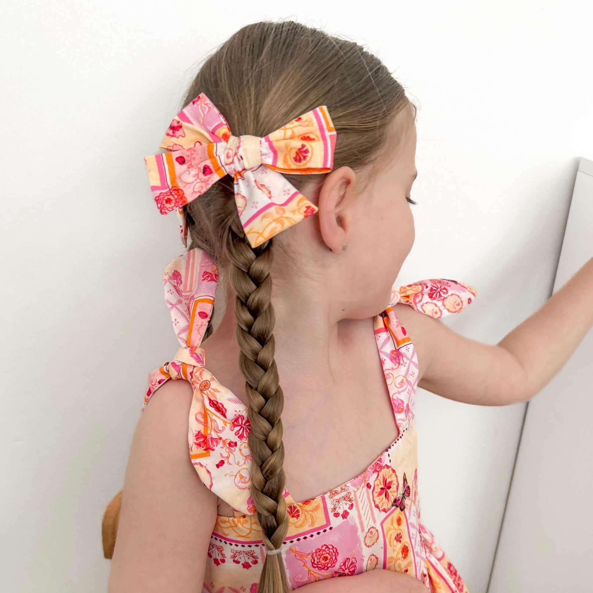 Complete your little one’s look with our Villa Rosa Large Bow, designed in our European-inspired print. Featuring a beautiful blend of pinks, corals, and golden tones, this bow adds the perfect finishing touch to any outfit - whether styled for playdates, parties, or everyday sweetness.
