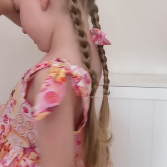 Bring a touch of European charm to your little one’s wardrobe with our Villa Rosa Peplum Top. Featuring a dreamy mix of soft pinks, corals, and golden tones in an exclusive vintage-inspired print, this piece is both playful and elegant. The peplum silhouette with ruffles and adjustable tie up shoulder detail adds the perfect twirl factor, making it a sweet choice for everyday wear or special outings.
