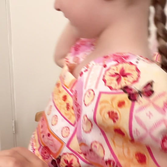 The sweetest statement piece for your little one’s wardrobe. Our Little Villa Rosa Bow Dress is designed in the dreamy Villa Rosa print, blending soft pinks, corals, and florals with whimsical charm. Featuring a beautiful bow-back detail, puff sleeves, and a twirly skirt, it’s perfect for playdates, parties, and every magical moment in between.